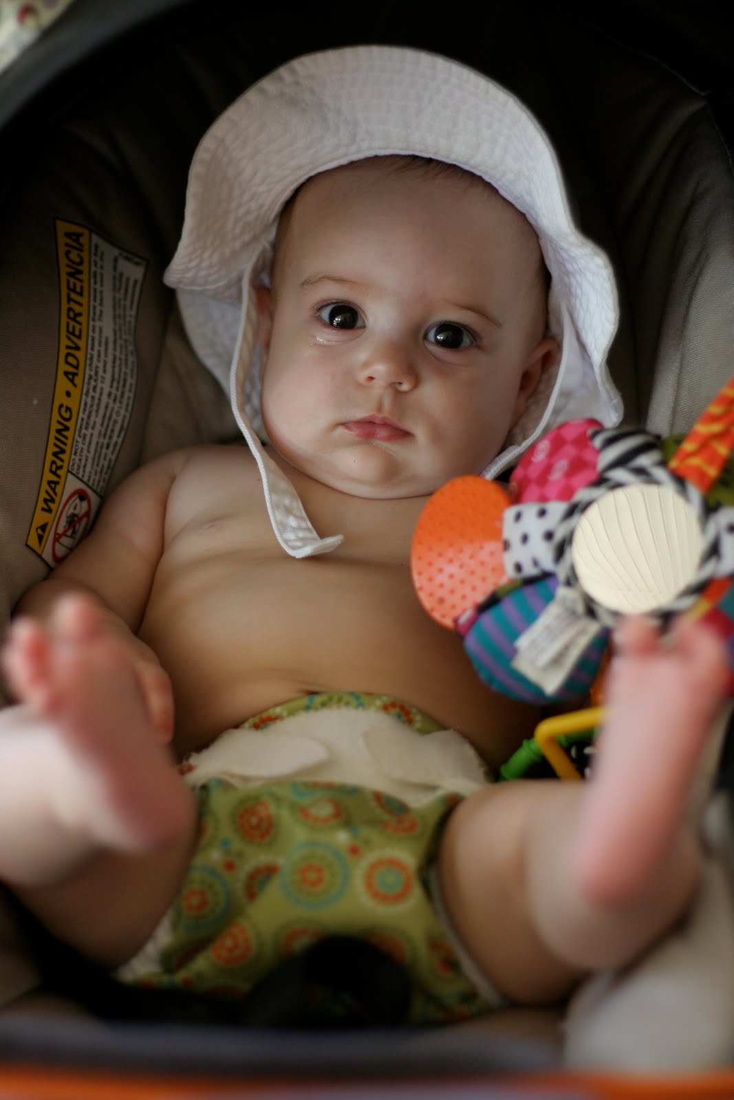 When Charis began to notice things we put a little hanging toy on her car seat. Soon enough, she began to reach out for it and play with it. Now she's putting it in her mouth and you'll find it has additional links hanging from it. The one we got is from Amazing Baby. (but I don't think the brand/kind really matters)